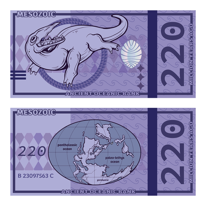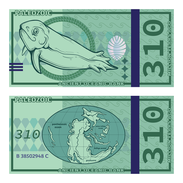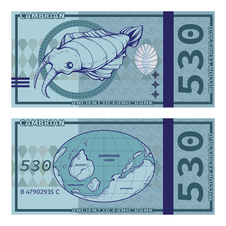 Cambrian Currency, a fictional paper currency with each bill representing a different era in the prehistoric ocean.